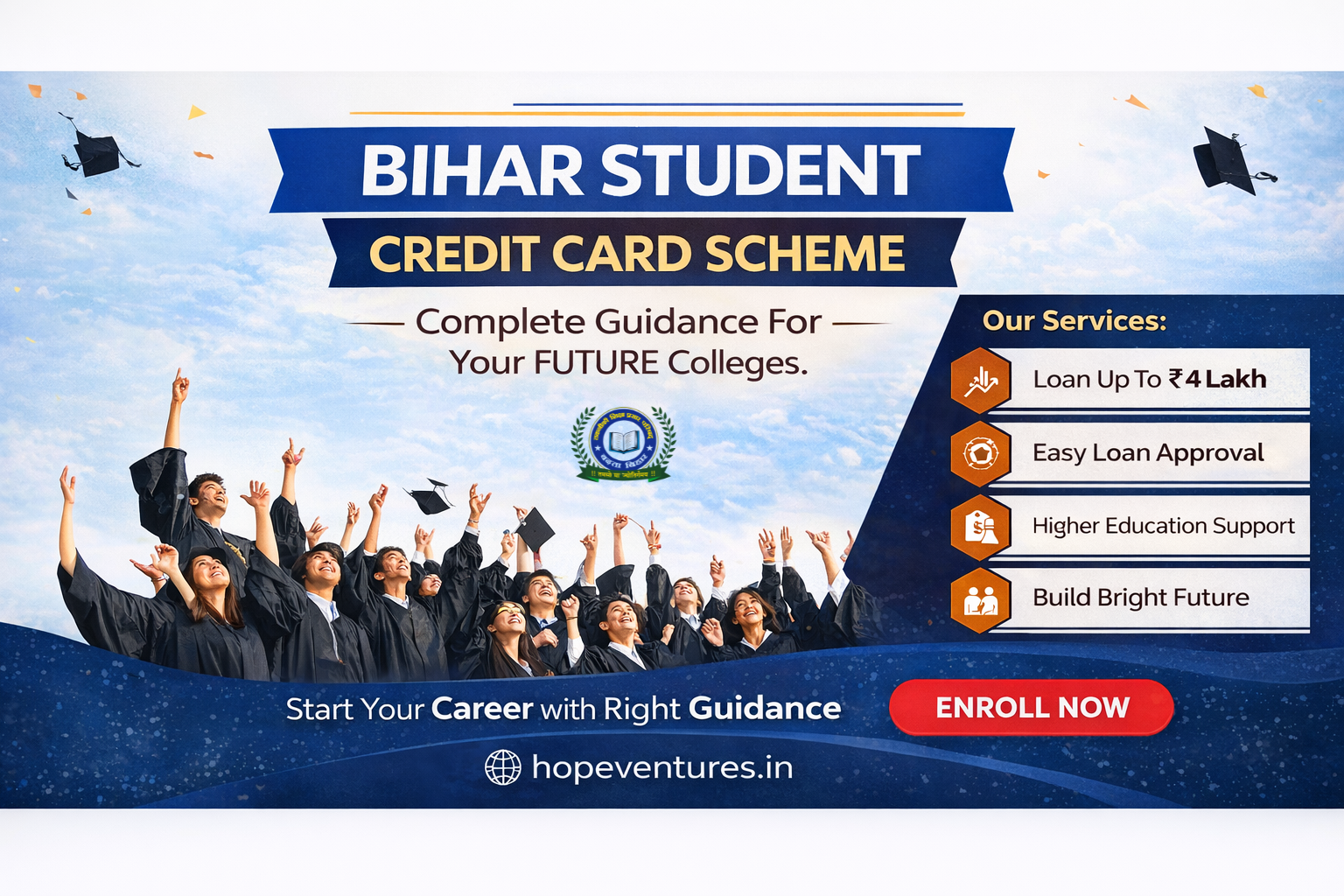 At Hope Ventures, we strongly believe that initiatives like the Bihar Student Credit Card Scheme play a transformative role in shaping the future of students. With the right guidance, admission support, and loan assistance, students can confidently pursue their dream courses and build a stable professional career. Our mission is to support students throughout the BSCC application process, admission guidance, and education loan assistance, ensuring that financial challenges never become a barrier to learning.